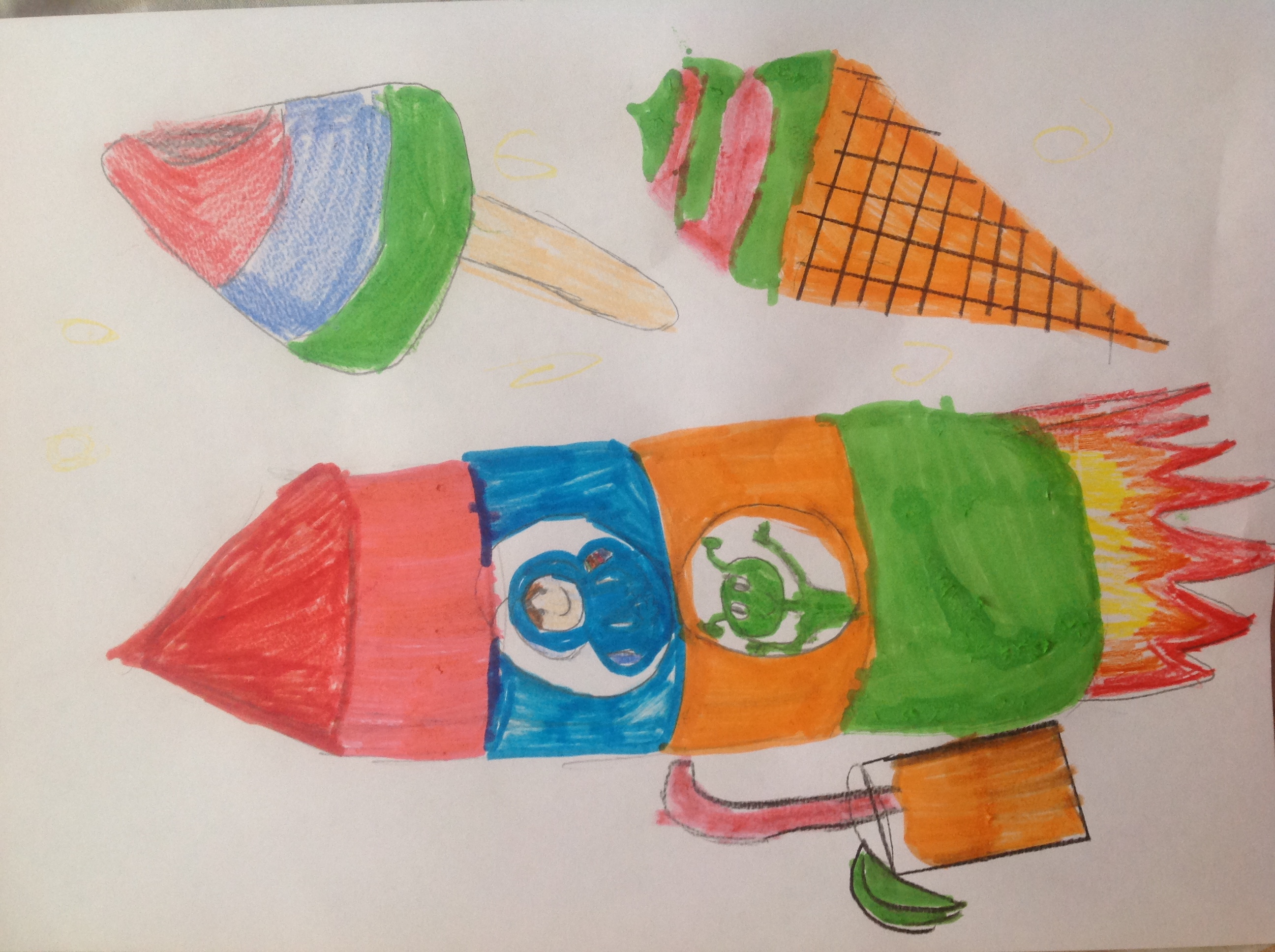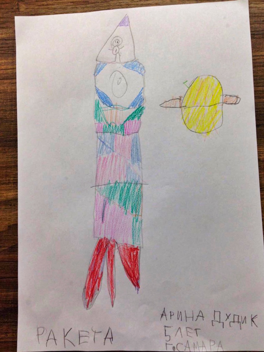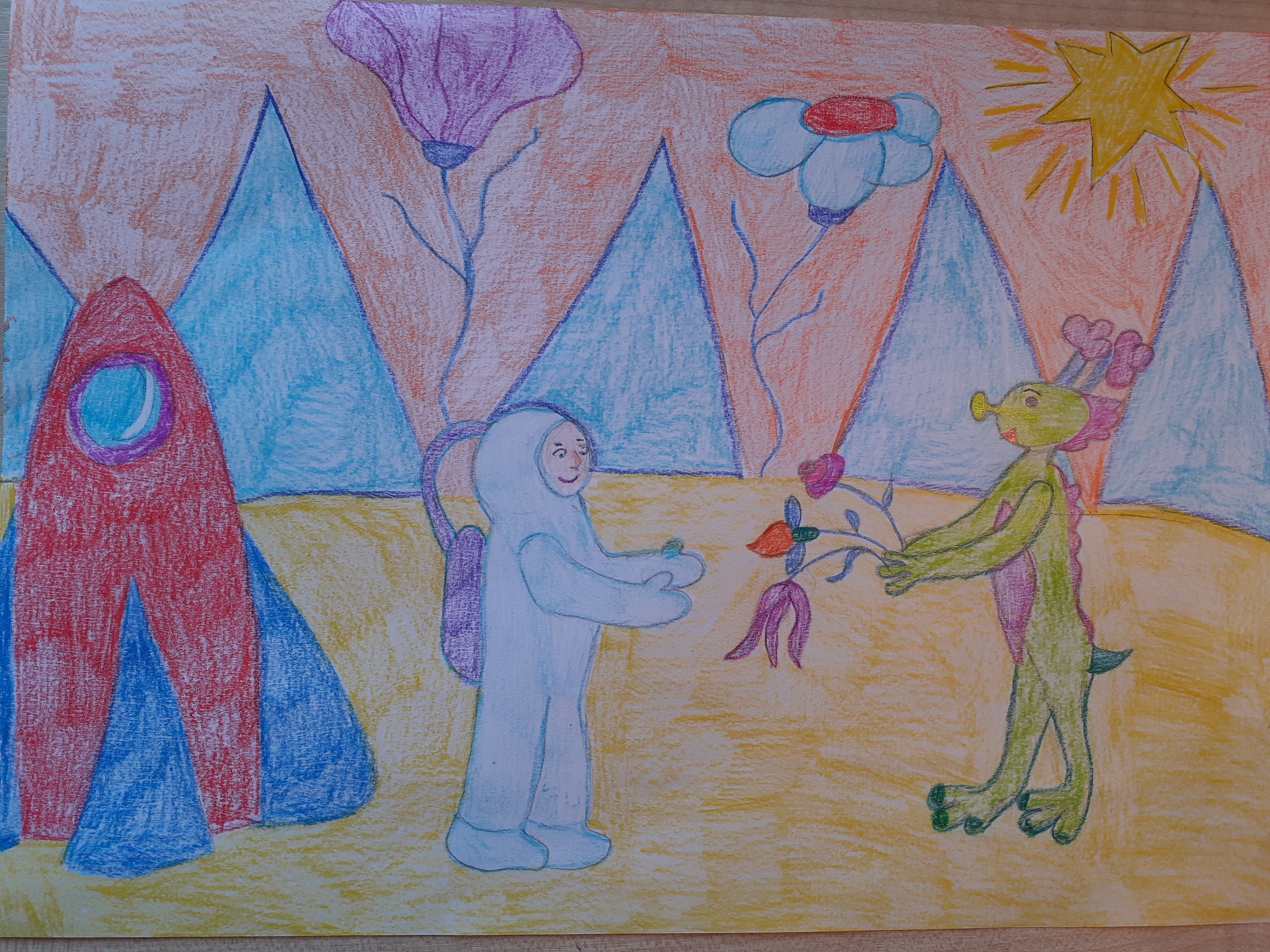 На рисунке изображены я и моя двоюродная сестра. У нас очень лёгкие костюмы и они дают сильное тепло! У нас на волосах пучки, а на пучках пластырь , который даёт воздух всему телу! Ещё на рисунке изображены четыре планеты: Венера на которой живут Венеряне, у них семь ног, кошачьи уши и маленькие крылышки! Солнце, на котором живут солнцеляне. Они похожи на змей с глазами как у улитки! Марс, на котором живут марсиане: У них три уха похожие на антенны , три ноги, зелёная кожа. Марсоход которые запустили недавно! И конечно же земля с, которой запустили Телепорт. С помощью него я и моя сестра попали в космос! Я очень хочу чтоб мой рисунок выиграл!!!!!