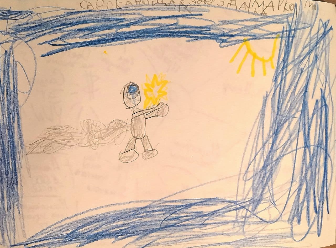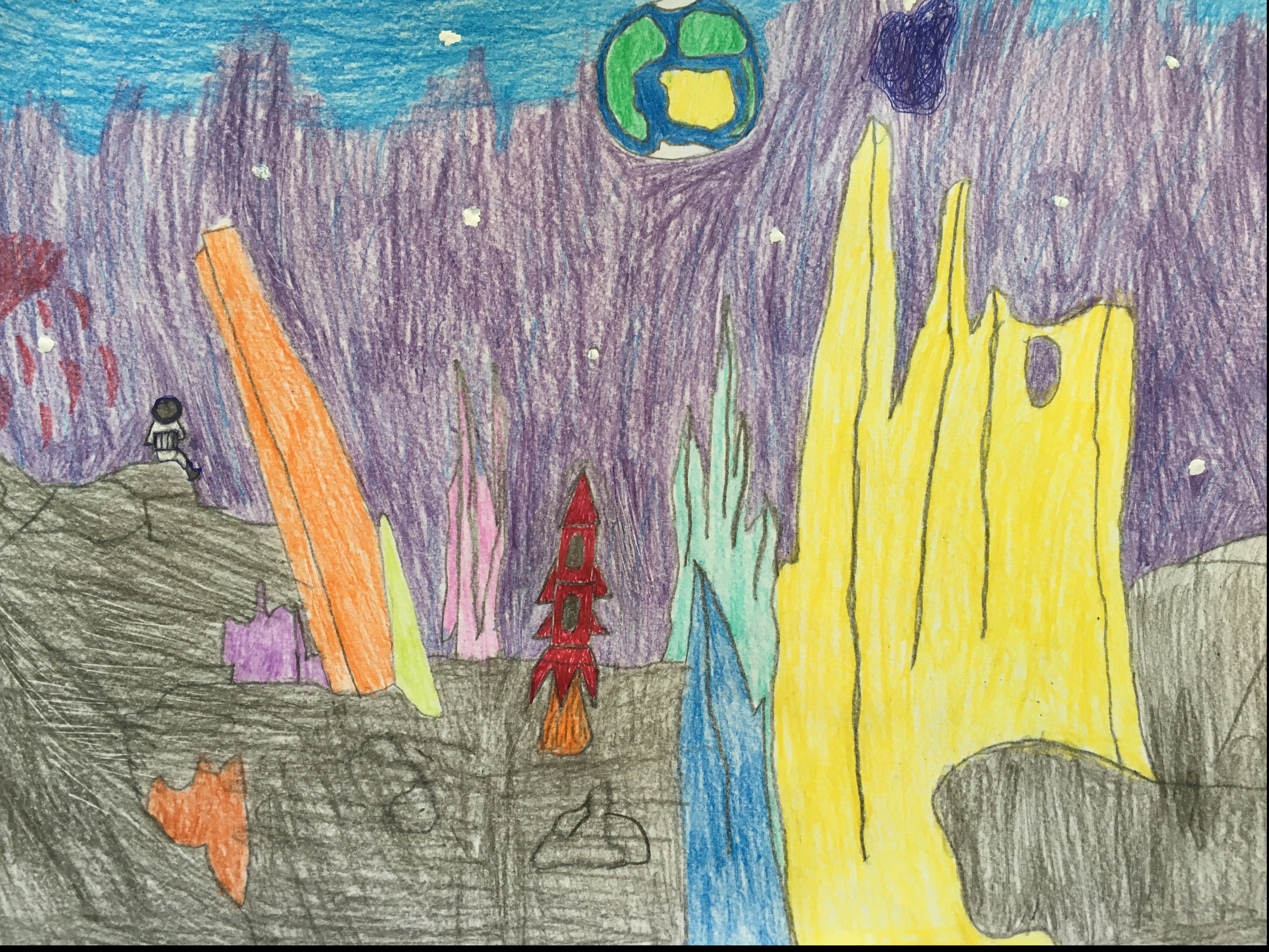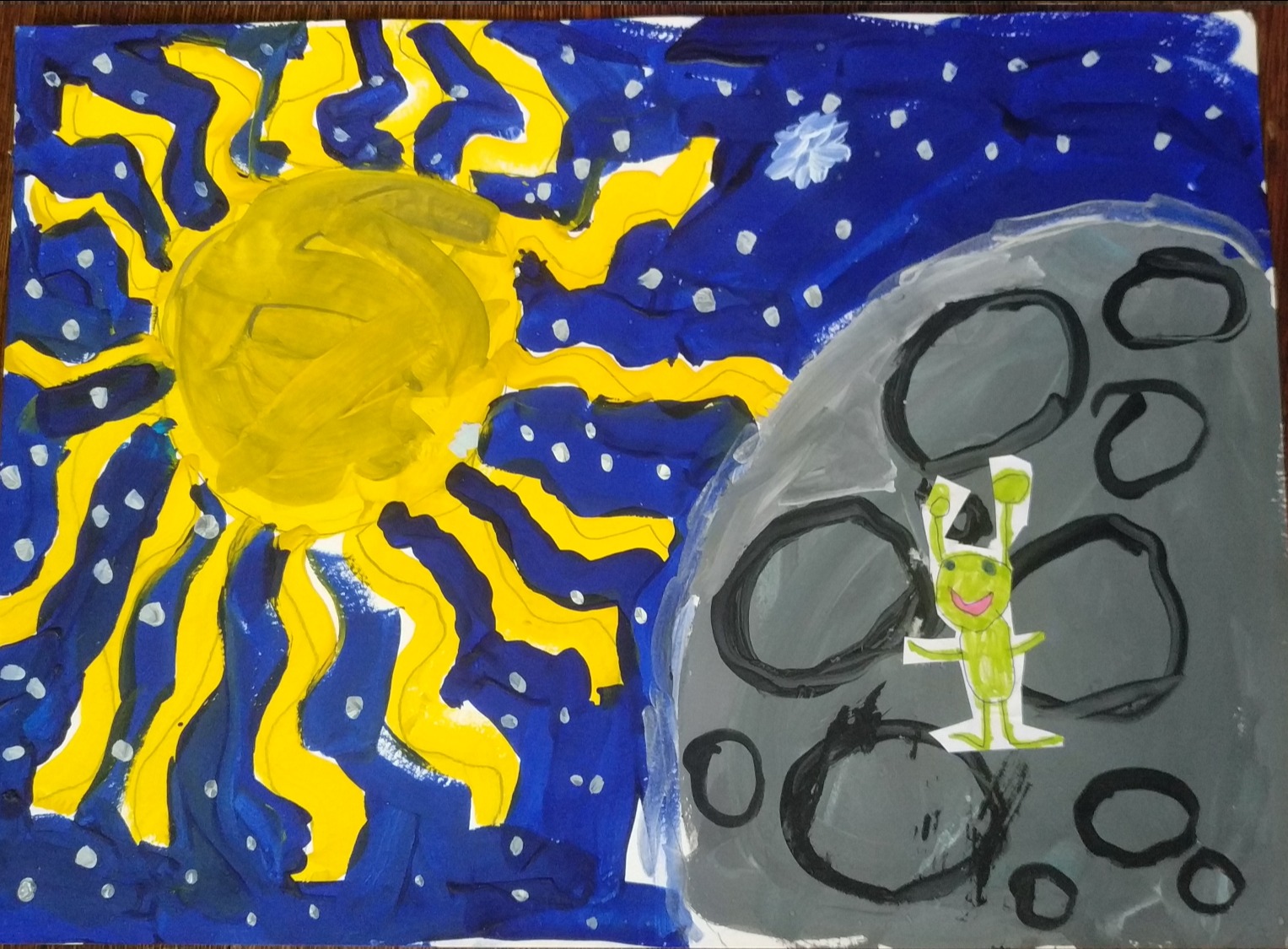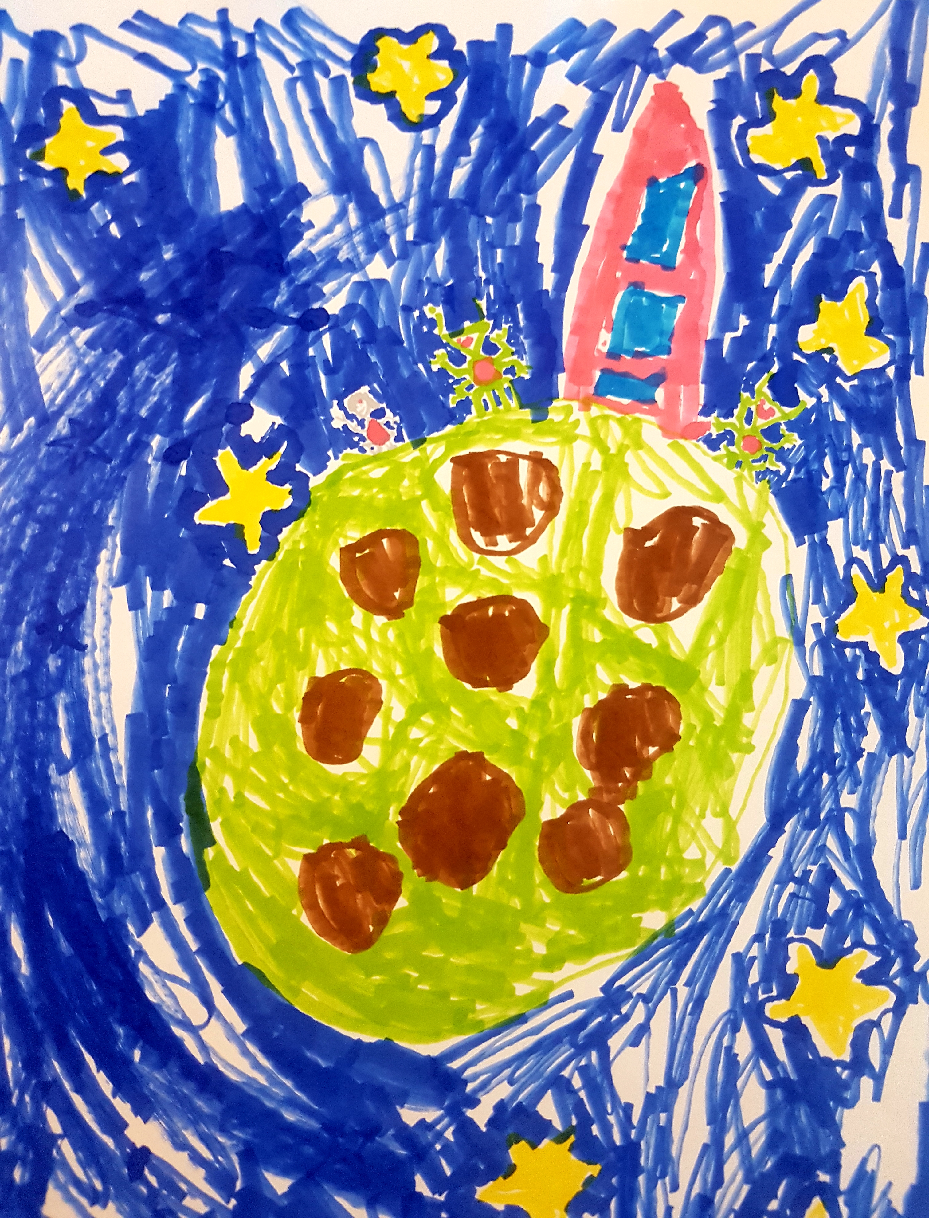 Я нарисовала планету Печенька, которая находится очень далеко от планеты Земля. На ней живут инопланетяне с 4-мя ногами и 4-мя руками. Они умеют стрекотать когда шевелят руками, а ещё они очень гостеприимные, потому что, когда я прилетела к ним на своей розовой ракете они угостили меня с чаем с печеньками.