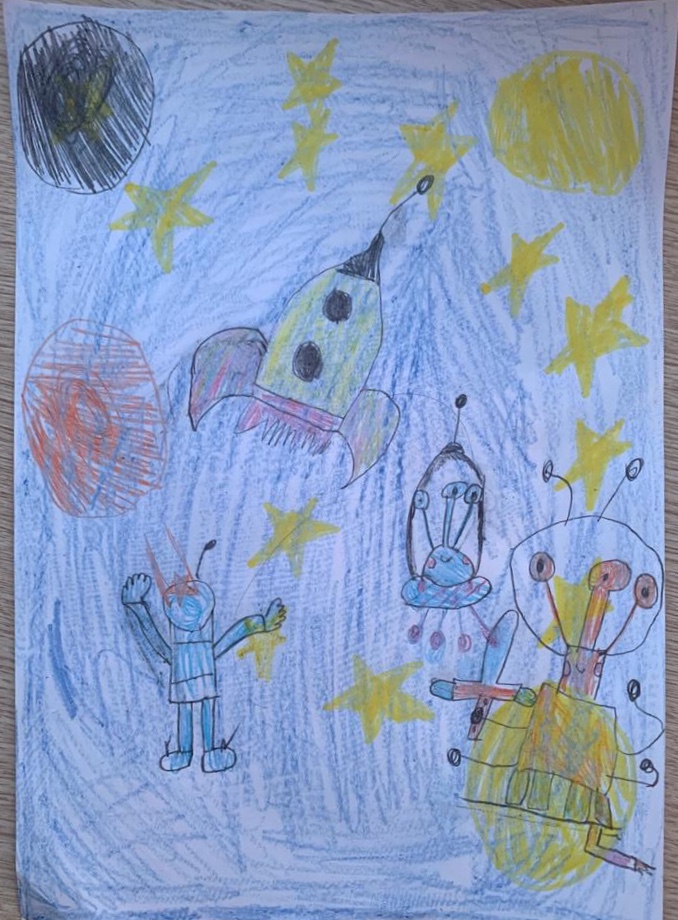 Меня зовут Кристина, мне 12 лет, я живу в городе Москва. Всю свою жизнь я слушаю Детское радио вместе со своей семьей и не представляю жизни без него, его ведущих и суперинтересных программ. Мне кажется вся Вселенная должна его слушать, тогда всем будет радостно и интересно жить. Надеюсь мой рисунок порадует весь космос!